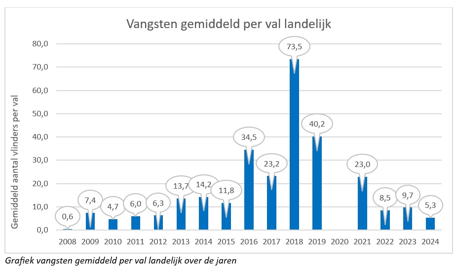 In de bijna 2300 feromoonvallen werden er gemiddeld 5,3 per val aangetroffen, het laagste aantal sinds 2010. Het monitoringnetwerk was toen net opgestart.